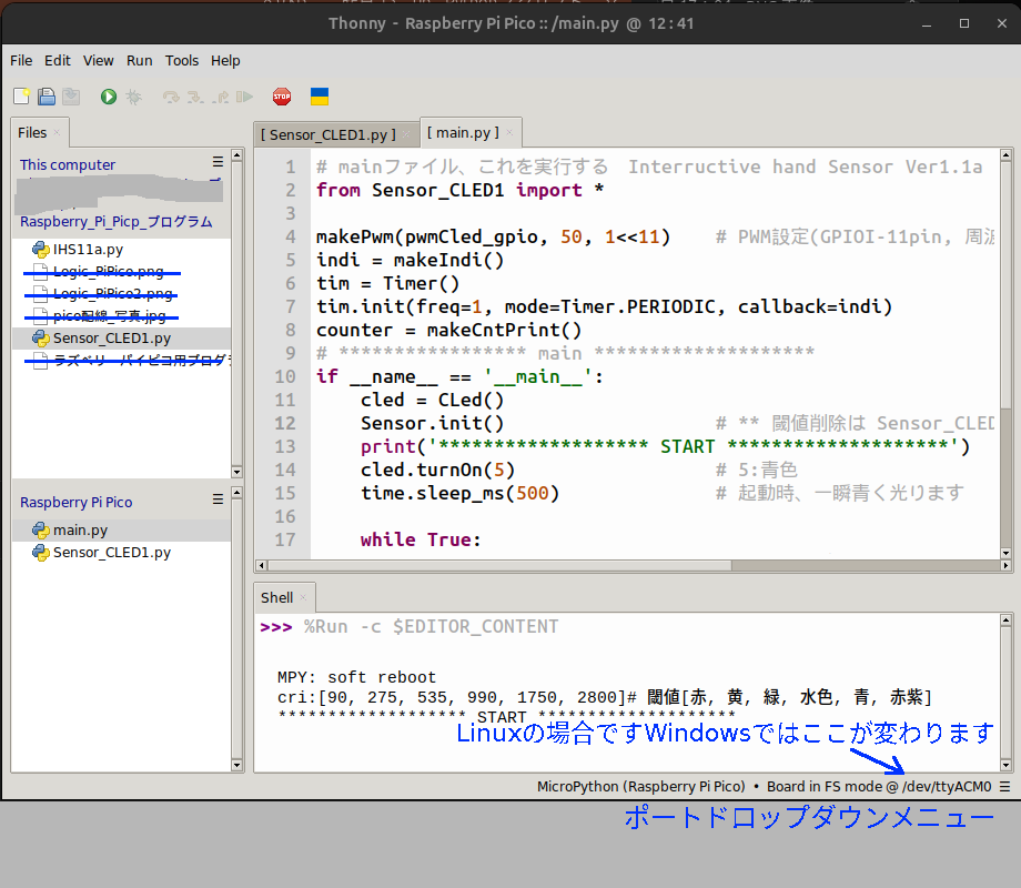 ・IHS11a.pyとSensor_CLED1.pyをRaspberry Pi Pico内に保存する。この時IHS11a.pyはmain.pyにリネームして保存する。